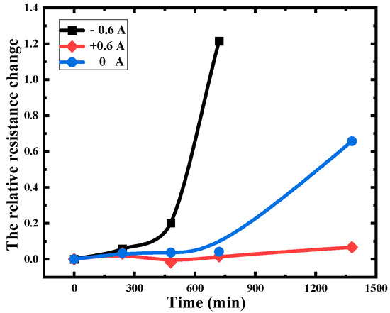 Electromigration, a prominent failure mechanism in heterogeneous systems, induces the movement of electrons under an electric field, resulting in the formation of IMCs that can have deleterious effects on device functionality. In such systems, the directionality of electromigration is a critical consideration due to the presence of diffusion caused by atomic chemical potentials. The polarity effect of electromigration is that the driving direction of electromigration coincides with atomic diffusion, thereby accelerating the diffusion of atoms and promoting the formation of IMCs, ultimately leading to degradation of the bonding lifetime [32,33]. Conversely, if the electromigration’s driving direction opposes that of metal atoms, which hinders atom diffusion and delays the formation of IMCs, thus enhancing bond strength and the system’s lifetime to some extent. The resistive properties of the interface were investigated as a function of aging time under three different applied currents (+0.6 A, −0.6 A, 0 A), which was defined as the forward current flowing from the gold ball to the Al pad with the results presented in Figure 4. It can be observed that the rate of resistance change under the forward current is significantly lower compared to that under the reverse current stress and the condition of solely high temperature stress. Particularly under the reverse current stress, the relative resistance change rate showed a sharp deterioration.