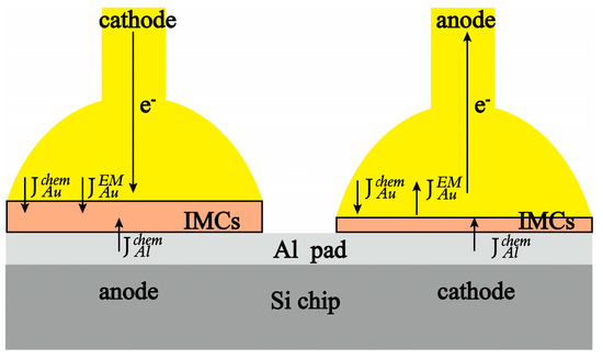 The core predicament lies in the fact that the conventional Au-Al wire bonding relies on the contact between heterogeneous metals, which leads to weakened bond strength due to the diffusion of metal atoms into one another, eventually resulting in the creation of intermetallic compounds (IMCs) and Kirkendall voids [7,8]. This significantly reduces the operational lifespan of wire bonding, especially under conditions of high temperature. Furthermore, it has been demonstrated in previous studies [9,10,11] that electromigration accelerates the formation of IMCs and voids. Electromigration is driven by the force of the electron wind, which involves the exchange of momentum between electrons and metal atoms, propelling the atoms to leave their original location and migrate elsewhere. The dependability of wire bonding is further undermined by the aggregation of atoms at the anode and the presence of voids at the cathode, necessitating a comprehensive inquiry into the reliability of wire bonding with respect to high temperature and electromigration challenges [12].