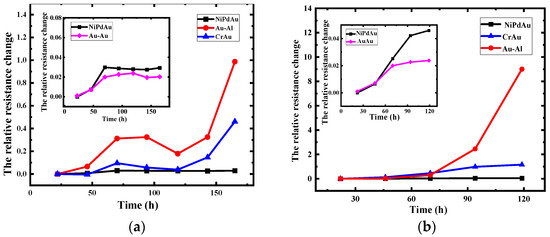 Figure 6. The variation of relative resistance change with aging time. (a) 0.6 A, 250 °C; (b) 250 °C.