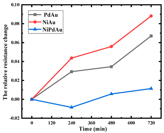 Figure 7. Relative resistance change rates of NiPdAu OPM structures with different thicknesses.