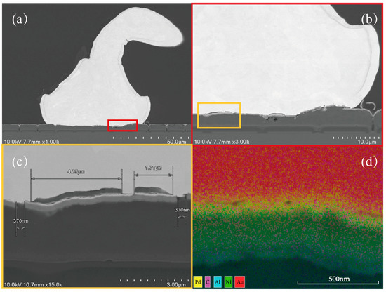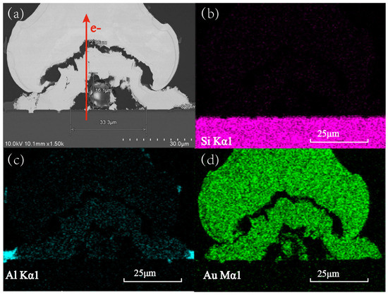 Figure 9. The SEM and EDX images of the annealed Au-Al bonded structure. (a) SEM image of the Au-Al bonded interface; (b) EDX image of Si element in bonded interface; (c) EDX image of Al element in bonded interface; (d) EDX image of Au element in bonded interface.