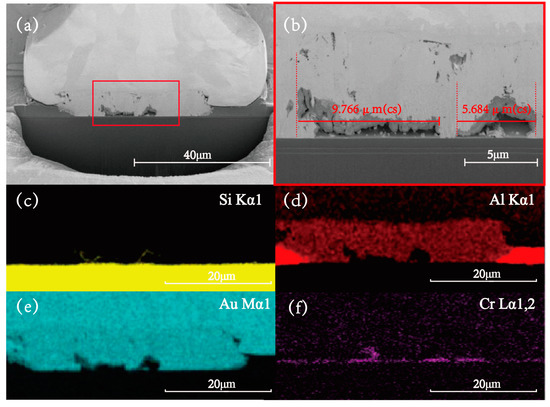 The microscopic morphology of the CrAu structure is illustrated in Figure 10, which presents a conspicuous IMCs at the bonding interface, indicating interdiffusion between the atoms, which is supported by the findings in Figure 10d,e. Additionally, voids measuring 9.766 μm and 5.648 μm were observed at the interface, which explains the rise of the second period of interfacial resistance. In contrast to the Au-Al bonding system, the CrAu OPM structure does not exhibit significant lateral consumption and continuous cavities, implying that the CrAu structure is more resistant to electromigration under similar test conditions. However, the EDX images showed that the Cr element also diffused during long-term aging, mainly due to the thinness of the Cr layer, leading to limited resistance to electromigration. Thus, for practical engineering applications, the OPM process should be optimized with actual requirements in mind.