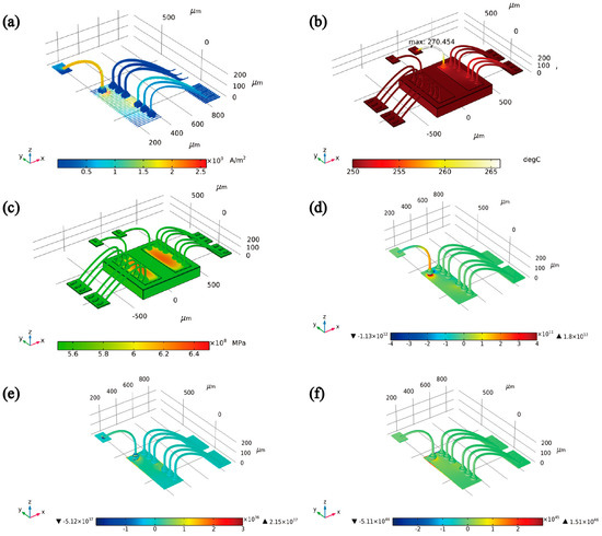Figure 12. The Distribution of physical fields and the AFD fields. (a) The distribution of current density; (b) The distribution of temperature; (c) The distribution of stress; (d) The distribution of electromigration AFD; (e) The distribution of thermal-migration AFD; (f) The distribution of stress-migration AFD.
