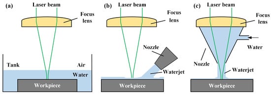 Schematic of water-assisted laser machining. (a) underwater laser machining; (b) off-axis waterjet assisted laser machining; (c) coaxial waterjet assisted laser machining.
