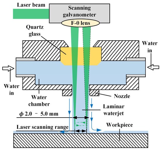 Different from underwater laser machining (Figure 1a) and waterjet-assisted laser machining (Figure 1b), by configuring the waterjet coaxially with the laser beam (Figure 1c), when the waterjet with a certain pressure hits the target, the ablated material and cavitation bubbles in the machining area are taken away by the waterjet. At the same time, the cooling effect of water can effectively reduce the temperature of the material heated by the laser and reduce the conduction of heat to the surrounding materials and the thermal stress imbalance caused by the heating of the material. CWALSM is one of the water-assisted laser machining, as shown in Figure 2. The laser beam passes through the quartz glass and is focused on the workpiece surface after being transmitted in the laminar waterjet. The scanning galvanometer controls the high-speed scanning movement of the laser beam in the radial range of the waterjet diameter. Therefore, the diameter of the waterjet needs to be larger than that of the hole being machined. According to the different machining apertures, the diameter of the water column is generally ø2~ø5 mm. It can significantly reduce the coupling difficulty of laser and waterjet, and avoid the laser beam from damaging the nozzle wall due to mechanical vibration and other reasons, thereby improving system stability.