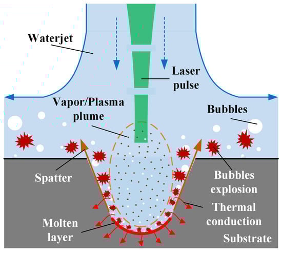Water-assisted laser machining involves the interaction of three factors: laser, water, and target material, which is more complicated than laser machining in the air. In a gas environment, when a high-energy short-pulse laser beam irradiates the surface of the target, the target in the focused area absorbs the laser energy through an inverse bremsstrahlung process to vaporize and ionize, forming a high-temperature and high-pressure plasma, which then expands and explodes to remove the material []. The recast layer and HAZ on the sidewall are formed. As a result of the melt accumulation, protrusion is formed around the entrance to the machining area. When the high-energy short-pulse laser focuses on target materials in water, cavitation, and vaporization bubbles are generated at the machining area [,]. However, the bubbles, spatter, ablated materials, and vapor/plasma plume can be expelled by high-speed waterjet in CWALSM, as shown in Figure 3. With a high-speed waterjet, the ablated materials and microbubbles generated in the laser machining area could be washed away when expelled. In addition, the laser plasma generates recoil pressure on the target material during outward expansion and sputtering. If in the water region, the expansion of the plasma is confined due to the incompressibility of the water, the plasma-induced recoil pressure on the target increases []. Fabbro et al. [] reported that the plasma-induced recoil pressure in the confinement of the water layer is 4–10 times higher and the duration of the shock wave is 2–3 times longer than the without water regime under the same laser power density. This tends to increase the laser ablation rate in water confinement. In addition, under the action of a high-energy short-pulse laser on the underwater target, the liquid near the solid wall heats up rapidly, and cavitation bubbles are continuously generated []. This is a special phenomenon of laser-matter interaction that occurs in a liquid environment. When the cavitation collapse near the solid wall, a high-speed liquid jet directed at the target is formed. When there is no water layer between the cavitation bubbles and the solid wall, liquid jet will cause a higher impulse against the wall []. With the action of the waterjet, the vaporization/cavitation bubbles are accelerated out of the machining area and explode. The pressure gradient caused by the explosion accelerates the plasma out of the machining area []. Thus, the shielding effect of the plasma plume on the incident laser energy is weakened, and more laser energy will act on the target material []. At the same time, the explosion of cavitation bubbles prevents the molten metal from resolidifying on the machined surface, reducing the formation of the recast layer. Finally, the excess laser energy remaining in the evaporated material is absorbed by the fluid water and taken away. Since the fluid water blocks the heat accumulation, the target material around the laser focusing area is protected, and the thermal damage is reduced. As the laser beam moves, the target material surface is rapidly cooled by the fluid water [].