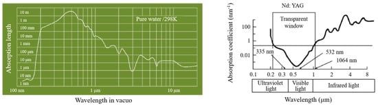 Due to the optical characteristics of water, there is an energy loss when the laser is transmitted in water. Therefore, the degree to which water absorbs the laser is an important factor to consider. Figure 4 illustrates that pure water has lower absorption in the green and ultraviolet bands [,]. The laser transmission over a 25 mm waterjet is as high as 99% at 532 nm, and 60% at 1064 nm. According to Beer-Lambert’s law, the laser intensity (I) after the laser beam passes through 2 mm optical quartz glass and 80 mm water layer (lw) can be calculated as: