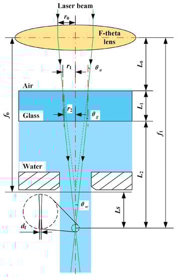 Here, na, ng, nw, f0, and r0 are the refractive index of air (1.0), the refractive index of quartz glass (1.46021), the refractive index of water (1.333), the working distance of the laser in air, and radius of the laser beam before entering the F-θ lens (2 mm), respectively. Since the refractive index of water is smaller than that of quartz glass, when the laser beam enters the water from the air, the position of the laser focus will move downward along the axis. Simultaneously, the working distance (f1) of the laser underwater will increase accordingly, expressed as: