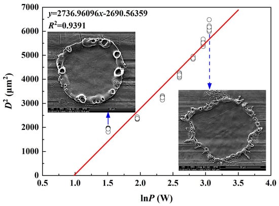 Equation (13) can be regarded as a linear relationship of D2-lnP, with a slope of 2ω02. Therefore, according to the definition of laser ablation threshold, the ablation threshold can be obtained by the D2 vs. lnP curve with an extrapolation to D2 = 0. By sorting out and calculating the experimental data, the relationship between the square of the ablation diameter and the logarithm of the laser average power (waterjet speed of 5.19 m/s) was obtained. The results are shown in Figure 8. It can be seen from Figure 8 that the diameter of the laser single pulse ablation crater increases with the increase of the laser average power. By calculating the fitting curve D2-lnP, when the ablation craters diameter D2 = 0, it can be concluded that the K4002 nickel-based special alloy coaxial waterjet assisted laser single pulse ablation threshold is φth = 4.15 J/cm2.
