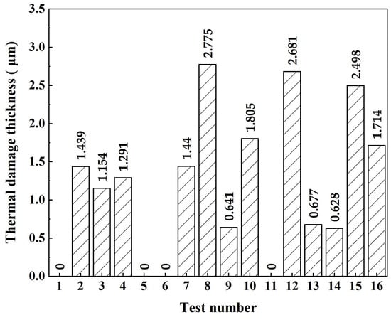 Laser machining is a multi-parameter coupled nonlinear process. It is the key to laser machining to explore the effects of each parameter on the thermal damage thickness layer under the coupling effect. In this paper, the variance and range analysis were used to process the orthogonal experiment data, and the effects of various factors on the thermal damage thickness and the optimal level combination were obtained. The thermal damage thickness obtained in each group of tests is shown in Figure 9. As can be seen from the figure, the maximum thermal damage layer thickness is 2.775 μm. In particular experimental conditions, CWALSM can realize machining without thermal damage.