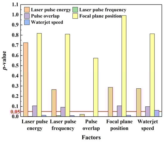 It can be seen from Figure 10 that when the laser pulse energy is used as a factor, and the laser pulse frequency, pulse overlap, focal plane position, and waterjet speed are used as covariates, the p-value of the laser pulse energy is greater than 0.05, indicating that the laser pulse energy has no significant effect on the thermal damage thickness. When laser pulse frequency is used as a factor, and laser pulse energy, pulse overlap, focal plane position, and waterjet speed are used as covariates, the p-value for laser pulse frequency is 0.011, which is less than 0.05, indicating that laser pulse frequency has a significant effect on thermal damage thickness. When the pulse overlap is used as a factor, and the laser pulse energy, laser pulse frequency, focal plane position, and waterjet speed are used as covariates, the p-value of the pulse overlap is less than 0.001, indicating that the impact of the pulse overlap on the thermal damage thickness is highly significant. When the focal plane position is used as a factor, and laser pulse energy, laser pulse frequency, pulse overlap, and waterjet speed are used as covariates, the p-value of focal plane position is greater than 0.05, indicating that the effect of focal plane position on thermal damage thickness is not significant. When the waterjet speed is used as a factor, and the laser pulse energy, laser pulse frequency, pulse overlap, and focal plane position are used as covariates, the p-value of the waterjet speed is 0.062, which is closer to 0.05, indicating that the effect of the waterjet speed on the thermal damage thickness is significant.