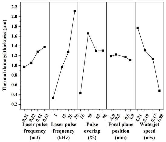 In addition, the main effect curve of various factors on the thermal damage thickness was obtained, as shown in Figure 11. It can be seen from the figure that the regression line at the focal plane position is relatively gentle, and has no significant effect on the thickness of the thermally damaged. The regression line of laser pulse frequency and waterjet speed is steep, which significantly impacts thermal damage thickness, and reducing laser pulse frequency or increasing waterjet speed can reduce thermal damage thickness. This is because most of the heat in the machining area is absorbed by water during the laser pulse-off time, which reduces the heat transfer and accumulation of the material []. At the same time, the high-speed waterjet with a stronger cooling effect and initial kinetic energy can take away the ablated material in the machining area, reducing the formation of the recast layer. When the laser pulse frequency is 1 kHz, the thermal damaged thickness is minimum. However, when the laser pulse frequency is too high, similar to continuous laser machining, the cooling effect of the waterjet is weakened. Figure 11 also shows that as the laser pulse energy increases, the heat effect cannot be offset by the cooling effect from waterjet flushing and heat diffusion [].