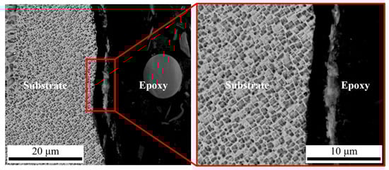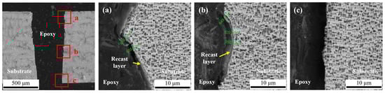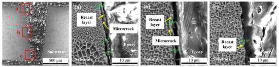 For nanosecond pulse laser machining in air, the interaction process between laser and material is dominated by heat conduction, and materials are removed by melting/vaporization. During the pulse-off time, molten material will build up and re-solidify on the hole sidewalls, which tends to create a recast layer. The boundary of thermal damage is specified where the metallurgical structure of the substrate material is changed from the original one to the otherwise. Figure 17 shows the cross-sectional structures of the hole drilled by laser machining in the air. As shown in Figure 17, it can be found that the thermal damage is the largest at the hole entrance and decreases with the increasing distance from the entrance. As the machining depth increases, the plasma recoil pressure is not enough to expel all the ablated material out of the machining area. Under the repeated action of the laser, the thermal damage in the machining area increases. When the hole is penetrated, the recast material attached to the hole side wall absorbs heat and re-melts/vaporizes is expelled. The plasma/ablation particles have an escape channel, which reduces the thermal damage to the hole side wall. The thermal damage thickness on the hole side wall is not uniform, and the thermal damage thickness range caused by laser machining in the air is about 0.499–2.394 μm. In addition, the recast layers are scaly and with the typical features of the material that melts and re-solidifies[], as shown in Figure 17. In addition, there are microcracks between the recast layer and the substrate material.