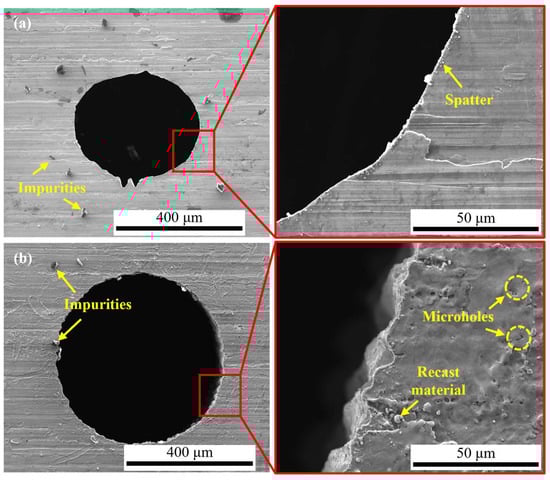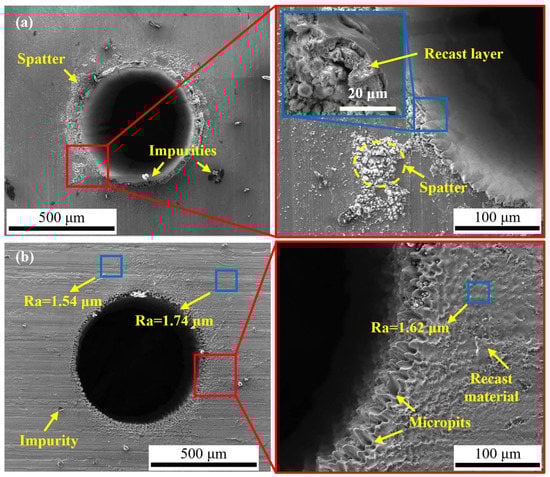 SEM morphologies of the hole entrance by laser machining in different conditions. (a) Laser machining in the air; (b) CWALSM.