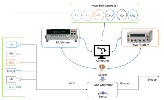 Gas-sensing measurements were investigated in a custom setup using an airtight chamber of about 250 mL with provision for gas injection and exhaust. This schematic is shown in Figure 1, and the desired concentration (in ppb and ppm) was achieved by mixing the analyte gas flow with synthetic air gas flow using two mass flow controllers (Aera FC-7700C) simultaneously. To rule out any surface interactions with moisture, the background environment was produced using a dry air gas cylinder (Air Products and Chemicals, Inc., certified for 0% humidity). The certified gas cylinders of target gases (NH3, NO2, CO, CH4, and C2H6O) were used for dilution in the measurements. The resistance in exposure to air and analyte mixes was continuously measured from the sensor using a Keithley K2700 data acquisition system. A calibration curve between voltage and temperature was prepared for accurate heating. The power source meter used was model ES-PS 3065-03B from Elektro Automatik, and it was used to power the platinum heater in sensor substrate TO-39. In Figure 1, the blue arrows represent the flow of data between the components of the system. The black arrows represent the gas flow through the chamber.
