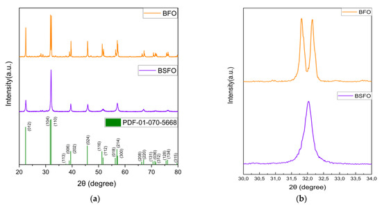 The XRD patterns in Figure 2a of the BFO match the peaks of powder diffraction file no: 01-070-5668, which belongs to the R3c space group with a rhombohedral structure. The main diffraction peaks at 2θ (2-theta) of 22.4, 31.72, 37.61, 38.91, 39.45, 45.72, and 51.26 well-matched the (0 1 2), (1 0 4), (1 1 0), (1 1 3), (0 0 6), (2 0 2), and (0 2 4) crystal planes [37]. The nanomaterial displayed almost identical peaks with no variation, and their crystal structures were well-indexed. The replacement of the Bi3+ in the BSFO spectra typically leads to some of the diffraction peaks disappearing, attributed to the relatively greater size of the Sr2+ (0.112 nm) as controverting to Bi3+ (0.103 nm), and to the difference in the size of crystals [25]. Figure 2b shows the enlarged part of the graph between 31° and 34°, which shows that in BSFO the doubly split peaks merge totally to form a single peak. This further confirms the presence of our doping and similar phase transformation behavior has been discussed by Hussain at al [27]. The crystallite size is given by Debye Scherrer equation = kλ/B cos θ. The value of k is set to 0.94 as we consider an approximately spherical shape and λ is set to 1.54 Å. The mean crystallite size is calculated for the peaks above in BFO to be 34 nm, and for BSFO it is 24 nm. They are also in close agreement with the SEM results.