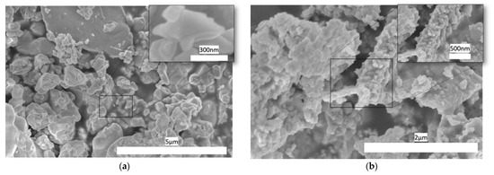 Scanning electron microscopy was used to confirm the materials’ nanocrystalline structure of BFO and BSFO. The SEM electrograph in Figure 3a,b show there are micrometer-sized primary flakes that are agglomerated with irregularly shaped nanoparticles on top of them. Their particle size is between 30 and 100 nanometers in size. The doping has contributed to the overall size by reducing the size of the particles overall. Strontium oxide has a greater melting point (2531 °C) than bismuth oxide (817 °C), which may be inhibiting grain development and causing the grain size to decrease [38]. EDX was also measured, and the values are listed below in the Table 1 for BFO and BSFO. The complete dataset is shown in the supplementary (Figures S2 and S3). They are in close agreement with the values published before, showing successful doping [26].