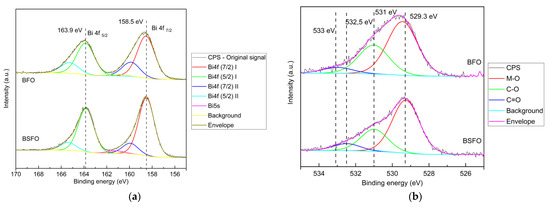 The high-resolution XPS measurement is shown in Figure 3 and Figure 4. The peaks in the graph in Figure 4a at 158.5 eV and 163.9 eV are related to Bi 4f 7/2 and Bi 4f 5/2, respectively, indicating positively charged Bi in mixed oxide compounds [40]. A closer analysis shows two Bi 4f components testifying for two binding sites, one major component at 158.5 eV and 163.9 eV (red curve), which may be associated with Fe3+–O–Bi3+ environment in the crystalline lattice, and the minor component at 159.9 eV and 165.3 eV (blue curve), which may be associated with the Bi3+–O–Bi3+ environment in the crystalline lattice [41]. The ratio of corresponding areas is 3:1. The doping of BFO by 20% strontium caused a reasonable decrease in the relative signal intensity of the blue component to a ratio ca 6:1. It indicates the replacement of the Bi ions in the higher binding energy positions (blue) by Sr2+, while Bi ions in the lower binding energy positions (red) are not influenced. The spin-orbit splitting energy between Bi 4f 7/2 and Bi 4f 5/2 is 5.40 eV, a typical value for Bi. Graph (b) in Figure 4 shows the peak at 529.3 eV, which is a noted signature for skeletal oxygen ions O2− in the lattice of crystalline oxides. The peak component at 531 eV is possibly due to the contribution of adsorbed carbon moieties containing the C-O group or due to hydroxyl groups, while the smallest component at 532.5 eV is associated with the carbonyl group (C=O) or carbonates. The relative signal intensity of the O 1s component at 531.0 eV decreased slightly with doping by strontium. However, this change might be due to the surface contamination moieties. These observations show a desirable change in the material surface structure due to the doping of Sr2+, as it could be very beneficial to the application of our aim in this work.