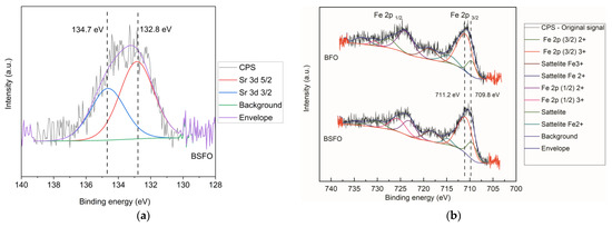 To confirm the doping of Sr2+, it can be seen in Figure 5a that a faint peak with two components at 132.8 eV and 134.7 eV testifies the presence of the Sr 3d 5/2 and Sr 2d 3/2 and corresponding typical orbital splitting [25]. Figure 5b shows high-resolution spectra of both original and doped materials in the typical range for Fe 2p lines. The analysis of iron photoelectron spectra is extremely peculiar, and the Gupta and Sen (GS) multiplets are to be used as shown in [42]. We undertook the analysis using such a multiplet approach, however, we feel the quality of data as well as the material crystallinity and homogeneity is too low and the fitting procedure may be prone to inaccuracies or exaggerated interpretation. To avoid it, we adopted and revised the common view on the BFO nanomaterials identifying two main components in the materials as Fe3+ and Fe2+ [25,41]. Unlike in these references, we did not fit only a few peaks to the original data obtaining thus various Fe3+/Fe2+ ratios, but the whole GS multiplet was fitted.