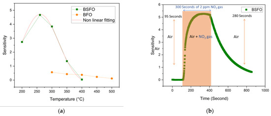 The first basic test is to analyze the transients of dynamic sensing of both the sensors to the NO2 gas flow at all possible thermal kinetics by varying the temperature. It is understood that the response of the sensors to NO2 gas depends on the relative balance between the adsorption and the desorption of the NO2 gas molecules and the reaction with the adsorbed oxygen [43]. This adsorption lacks the required amount of energy in low temperatures, showing slow sensing kinetics. The increase in temperature provides more energy for this reaction, enhancing the response but more than adequately increasing the desorption. The BSFO sensor shows a response of 4.7 times for gas injection of 100 s 2 ppm NO2 to the baseline at the optimal temperature of 260 °C. This test is depicted in Figure 6a using a total flow rate of 200 sccm. The fitting of non-linear form using a gaussian function with an orthogonal distance regression as an iteration algorithm is graphed on the sensitivity chart to manifest the optimal range for the highest sensitivity. The reference undoped BFO sensor was very resistant to record any baseline resistance values below 300 °C. It can be seen that the drop in operating temperature might be attributed to the introduction of new energy levels caused by the Sr doping element as well as the nano-size effect [44]. This test is repeated with a small difference of extending the time of gas injection to 300 s to reach maximum saturation and calculate maximum response and recovery times for 2 ppm of NO2. The sensitivity reaches 5.2 times and is relatively stable. Irrespective of looking at the physicochemical results, we presume to have successfully created abundant oxygen vacancy defects in the perovskite lattice, which compensated the acceptor doping of Strontium atom at A sites. This means that the p-type conductive behavior of our material is enhanced and would help us have a sufficient measurable resistance at relatively low temperature. Additionally, the gas adsorption is higher at lower temperatures, and therefore we see an enhancement in the sensing response. This test is depicted in Figure 6b.