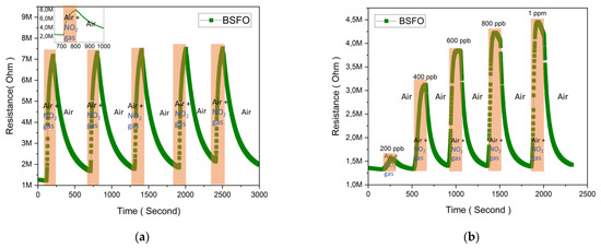 The Figure 7a BSFO sensor was further tested for repeatability by using the NO2 gas, injection period of 100 s, and concentration of 2 ppm. It was seen that the sensor response stays constant over five cycles, showing that all sensors are reliable with consistent response and recovery times. The inset graphs show some level of saturation in this gas injection and show that fast kinetics is achieved. This is clearly due to the lattice distortion and phase transformation. The increase in carrier concentration and electron mobility leads to a substantially bigger hole accumulation layer at the surface of the nanoparticle, therefore improving the sensing performance [45]. Another test to evaluate the lowest detection limit of this sensor is by varying the concentration of the target gas. The sample is tested with the NO2 gas, which is injected into the gas chamber from 200 ppb to 1 ppm for a period of 150 s. As per our system design, a higher flow rate of 800 sccm was used to reach such low concentrations of the target gas. In Figure 7b this measurement is repeated until 1 ppm and the noticeable lowest response is from 200 ppb, but the response from 400 ppb, 600 ppb, 800 ppb, and 1 ppm are relatively higher and more consistent. Utilizing the lowest allotted settings in the mass flow controller to obtain our LOD value of 200 ppb electronically means that mechanical function should be taken into consideration because it is anticipated that the electronic control of the orifice will take more time to reconfigure itself. We do not, however, establish an exemption specifically for this situation. This could be one of a number of contributing causes to the relatively weaker response at the lowest concentration. Otherwise, in addition to the effects of doping, the increase in the surface area due to the nano-size grains also creates more active reaction sites with the NO2 gas molecules. Energetically, doping also reduces the band gap energy to amplify surface reactions, allowing for more feasible electronic reactions and better sensitivity, which we hold accountable for our sub ppm gas sensing [45].