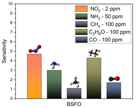 Finally, the BSFO specimen was investigated for its cross-sensitivity properties in the same conditions and using the same setup with the operating temperature of 260 °C. The prepared sensors were tested in the same manner for a transient dynamic response with gas analyte injection for 100 s for sensitivity responses toward other gases. The concentrations are indicated in Figure 9, where the sensor response towards various gases is depicted with a bar graph. The sensitivity is calculated and the BSFO sensor shows the largest response of 4.7 towards our analyte gas NO2. This further confirms the selectivity of our target gas over other competing gases in separate environments. Most other gas analytes tested were of higher concentration due to system configuration and gas cylinder availability. It showed close to moderate response sensitivity, noting that the second largest response belongs to ethanol albeit in high concentration. The responses to NH3, CH4, and CO are minimum. The low gas response to other gases, excluding NO2, signifies its high specific adsorption capability towards NO2. A low gas response is credited to its low electron-withdrawing ability. This is presumably due to the weak adsorption/diffusion with the material surface. The reference undoped BFO sensor remained insulating at operating temperature.