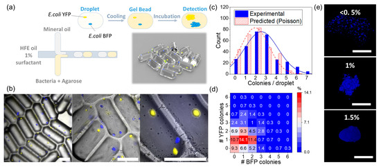 While bacteria in liquid droplets freely grew in the planktonic form, E. coli inside of the structured agarose microbeads formed tight three-dimensional colonies (Figure 1b). Since the strains of E. coli express YFP and BFP, Figure 1 clearly shows a fluorescence corresponding to their colonies’ appearance 12 h after inoculation. Detailed analysis of colony morphology is provided in a later section.