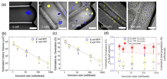 Effect of inoculum size on the final colony size of E. coli YFP and E. coli BFP in agarose microbeads after 24 h of incubation. (a) Overlap microscopic images of bacterial colonies in microbeads at different initial inoculation densities. Scale bar: 200 μm. (b) Relationship between estimated bacterial colony volume and inoculum size. (c) Relationship between the estimated number of bacterial generations produced in a single colony and inoculum size. (d) Volume occupancy of bacterial colonies in the microbead (left axis, yellow and blue circles) and total cell population (right axis, red squares) at different inoculum sizes. Error bars represent errors calculated from the standard deviation of the measured area of at least 59 sample colonies.