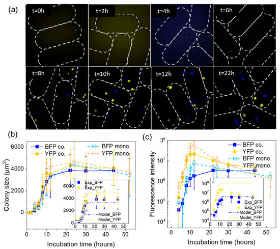 The growth of E. coli YFP and E. coli BFP in agarose microbeads. (a) 2-channel microscopic images of E. coli YFP and BFP growth in agarose microbeads at different time points at inoculum size of 2 cells/bead. Note that the images were taken at a random position. Growth curves of E. coli YFP and E. coli BFP in monoculture and co-culture (ratio 1:1) conditions were constructed based on (b) colony size and (c) fluorescence intensity. The insets show the experimental data of E. coli BFP and E. coli YFP coculture growth and its modeling curve. The fitted curve was obtained by simulating the experimental data based on Equation (1).