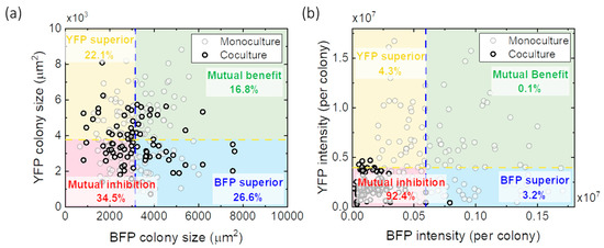 An increasing doubling time in co-culture (1:1) compared to monoculture in bulk liquid medium (Figure S12) indicates a negative (i.e., competitive) interaction between the two strains, whereas a decreased doubling time indicates a positive (i.e., cooperative) interaction. We tested the interactions between both strains in agarose microbeads (Figure S13) and liquid microwell plates (Figure S14). The results show that the presence of the other strain significantly increased the doubling time of E. coli BFP but had a slightly opposite effect on E. coli YFP. Still, both strains could not reach the final fluorescent intensity per colony as high as in monoculture conditions. To further illustrate this interaction, Figure 5 presents scatter plots that show a correlation between the two species’ final cell densities in agarose microbeads constructed based on colony size (Figure 5a) and fluorescent intensity (Figure 5b) at 12 h. The E. coli YFP and E. coli BFP were randomly paired and compared to the median of the monoculture case. Four sections were mapped out corresponding to the nature of the interactions. In monoculture conditions, we had no way to distinguish between interaction types, and we used observed colony sizes as a reference for comparison with the co-culture results. When adding the co-culture data to the map, both intensity and colony size shifted to the “mutual inhibition” corner, indicating that growth inhibition via competitive interactions prevailed.