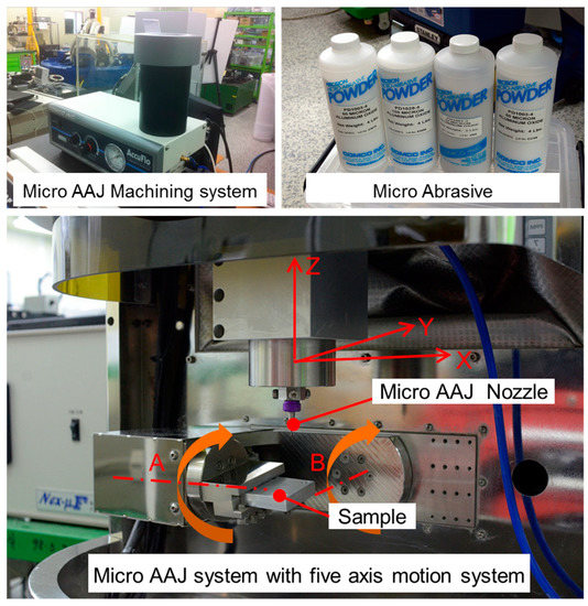 Figure 2 shows the micro-AAJ machining system, which consists of a micro-AAJ nozzle and a five-axis positioning system. Various micro-AAJ nozzles can be used, depending on the required surface structure, and three-dimensional machining is possible. Abrasive particle powder was produced using an AccuFlo AAJ machine connected with a 6 bar pressurized air source. Figure 2 shows the positioning system, which moves along five axes. An X–Y–Z positioning system was also used for the micro-AAJ nozzle, consisting of a motorized positioning system for microaccuracy. An A–C rotation positioning system (A axis: 360°; B axis: 180°) was used to rotate the sample, consisting of a motorized rotation stage.