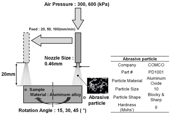 We used the setup shown schematically in Figure 3. The abrasive particles in the tank fell directly onto a vibrating feeder and were carried by the pressurized airflow into the tube. The abrasive particle powder consisted of 10 µm diameter alumina (Al2O3) sharp particles, which were injected into the compressed air flow to the nozzle through a rubber tube. This system allowed us to easily vary the feeding speed of the micro-AAJ nozzle and the rotation angle of the sample. The distance from the nozzle to the target could be varied within the range of 0 < d < 20 mm.