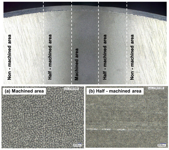 We tested ductile aluminum alloy, which is difficult to machine because of its low stiffness. We machined samples under eighteen different conditions, as listed in Table 1. Figure 4 shows images of machined samples. Figure 5 shows optical microscopic images of the surface texture. The surface can be divided into a non-machined area, a half-machined area, and a fully machined area. Figure 5a shows an area that was machined, and Figure 5b shows an area between the non-machined and fully machined areas. The size of the surface textures in the machined area was 20 µm. The width of each machined area varied according to the processing conditions.