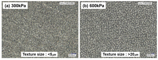 Figure 6 shows optical microscopic images of surfaces that were machined at different pressures. We found that the size of the surface features was larger at 600 kPa than at 300 kPa. Figure 7 shows surfaces machined at different traverse speeds. As the traverse speed increased, the machined area decreased, and the half-machined area increased.
