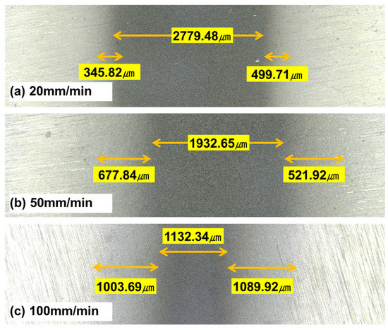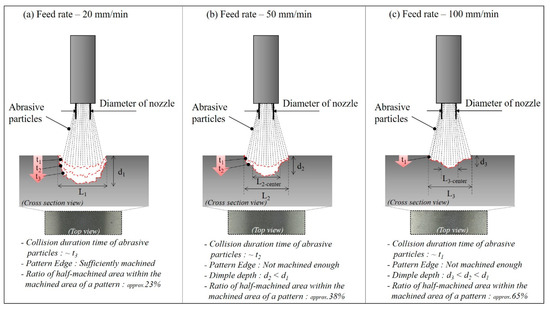 Li and Deng et al. [24] described that the number of particles colliding on the target surface decreases as the nozzle passing speed increases in AAJ micromachining. Furthermore, according to Li and Yeoh et al. [25], the change in the particle velocity in the radial direction of the nozzle increases as the axial distance from the nozzle outlet increases. That is, the velocity of the abrasive particles on the target surface decreases significantly from the center to the edge of the pattern. Therefore, the faster the nozzle moves, the wider the half-machined area because the edge area of the pattern cannot be sufficiently processed due to the reduction of the colliding particles. As shown in Figure 13, the proportion of the half-machined area increases from 23% to a maximum of 65% depending on the traverse speed under the same spray pressure and abrasive particle size conditions.