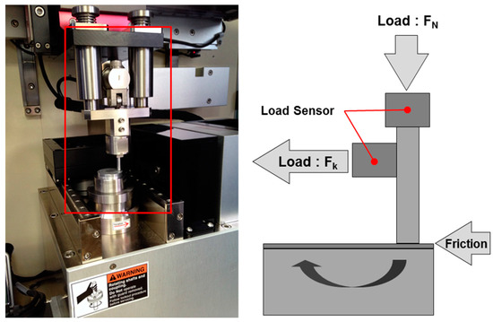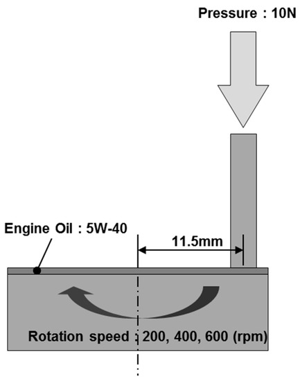 The coefficient of friction was characterized using a pin-on-disk tester. Figure 8 shows the friction test system and a schematic diagram of the apparatus. The testing machine was designed for contact between a cylindrical pin and a planar surface. The pin was installed in a metallic holder and fixed such that it could not rotate. The pins were 3 mm in diameter and 5 mm in length. The center of the pin holder was loaded in the direction normal to the disk-shaped samples, which were located beneath the pins and were rotated. The test conditions are listed in Table 2, and the experiment is illustrated schematically in Figure 9. The sliding-contact zone was fully soaked in typical 5W40 engine oil, which acted as a lubricant. The temperature was maintained at 27 °C. The coefficient of friction was calculated using the frictional torque measured at different rotational speeds of the disk. The frictional radius was 11.5 mm. To avoid unstable initial conditions, each test was carried out after a breaking-in operation consisting of applying a normal load of 10 N and a rotation velocity of 200–600 rpm for a duration of 2 min.
