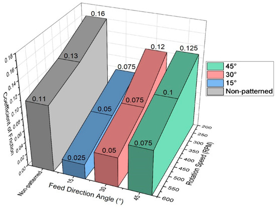 The relationship between the rotation velocity and the coefficient of friction for the non-machined sample is shown in Figure 10. The coefficient of friction was measured at velocities of 200, 400, and 600 rpm. Typical boundary lubrication behavior was observed; an increase in the angular velocity resulted in a gradual decrease in the coefficient of friction. For the non-machined sample, the coefficient of friction (µ) at low angular velocities was µ ≈ 0.16. At angular velocities of 600 rpm, it was µ < 0.11. The trends of all of the textured sample curves were similar to the non-textured sample curve. However, the textured samples exhibited coefficients of friction that were lower than that of the non-textured sample.