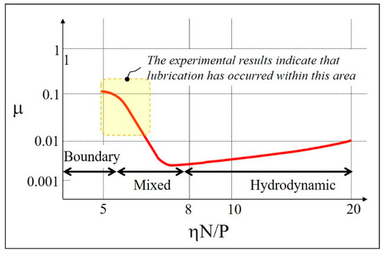 The tendency for the coefficient of friction to decrease with increasing angular velocity can be explained by the Stribeck diagram shown in Figure 11. Stribeck diagrams show the change in the coefficient of friction as a curve when switching from the fully hydrodynamic regime to the boundary lubrication regime [20,21]. The horizontal axis of the diagram is the value of Equation (1) presented below, and the vertical axis is the coefficient of friction μ value,