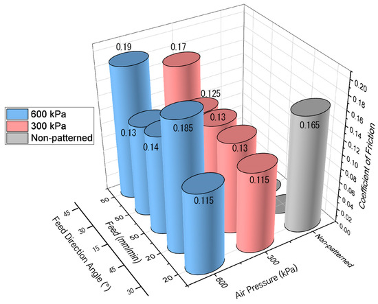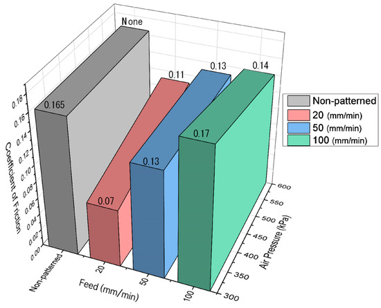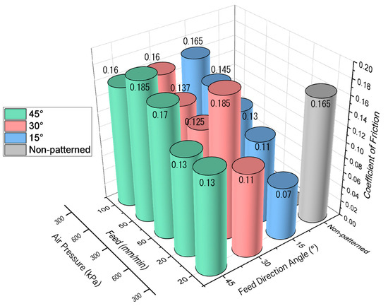 Figure 16 shows the coefficient of friction as a function of the pressure of the micro-AAJ. The coefficient of friction does not depend on the pressure change in the cases of 15 and 30°. The friction coefficients increase slightly with increasing pressure in the case of 45°, which can be explained by the fact that an increase in the pressure of micro-AAJ machining increases the surface roughness, which increases the coefficient of friction. However, if the contact area of the patterned surface is wide enough, little change in the friction occurs. A summary of the discussion is as follows.