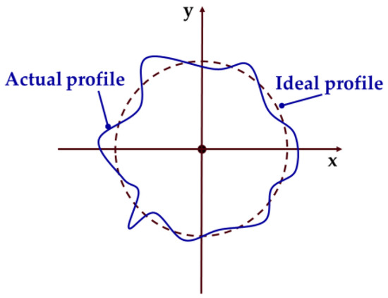 The circular cross-sectional profile of shaft parts is shown in Figure 1, with the solid line indicating the actual profile and the dashed line indicating the ideal profile. It can be found that the shape of the cross-sectional profile of the shaft parts in rotation will exhibit deterministic periodic signal characteristics, which can be expanded by Fourier series as