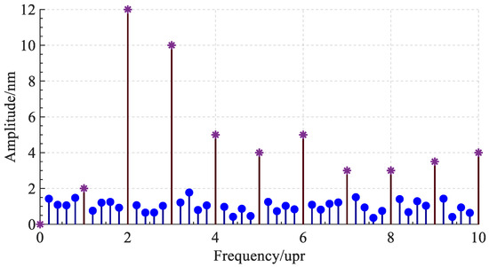 After Fourier transform, the synchronous error data are distributed in integer multiples of the spindle rotation frequency and its neighborhood, and the asynchronous error data are distributed in non-integer multiples of the rotation frequency interval, as shown in Figure 3. The lines marked with asterisks represent the frequency components of synchronous errors, and the lines with circular marks represent the frequency components of asynchronous errors. The synchronization error data, combined with the data of other probes or other measurement steps, can be further separated into the radial error of the spindle and the roundness error of the standard workpiece. The separation method of the synchronization error will be further introduced below.