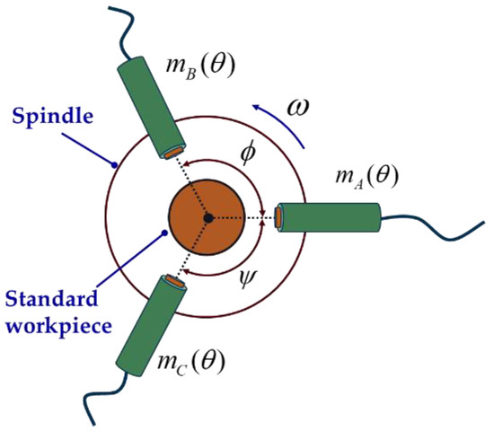 As shown in Figure 4, three sensor probes are placed at a certain angle to collect data synchronously. After removing the asynchronous error and the installation eccentricity of the standard workpiece, the data collected by the three sensors can be expressed as