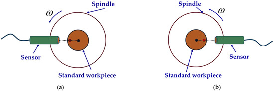 The measurement steps of the comparative experiment are as follows: first, the sensor probe is mounted in the 0° direction of the spindle for the first dataset acquisition, as shown in Figure 10a; after this, the fixture, sensor and standard workpiece are reversed 180° at the same time. Then, the sensor probe is in the 180° direction, acquiring the second set of data, as shown in Figure 10b. Before and after reversing, the speed of the spindle should be the same.