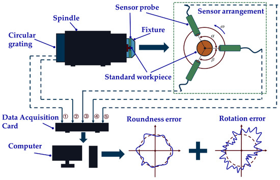 The system works as follows: firstly, the standard workpiece, fixture and sensor probes are fixed to the spindle; secondly, a servo control system is used to drive the spindle to rotate at a certain speed, three sensor probes are used to collect data, and two grating data are collected simultaneously; thirdly, the above five signals are imported into the computer and processed. Then, the radial error of the spindle and the roundness error of the standard workpiece can be obtained. Technical details will be given later in the experiments.