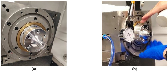 First, as shown in Figure 9a, the standard workpiece is adsorbed on the air-bearing spindle by the pressure of the vacuum, and the geometric center of the standard workpiece is roughly aligned with the axis of the standard workpiece; second, as shown in Figure 9b, a dial indicator is used to make rough adjustments so that the eccentricity of the standard workpiece is within 1 ; third, as shown in Figure 9c, the sensor probe is used for fine adjustments to make the eccentricity of the standard workpiece within 0.1–0.2 . The more accurate the centering, the higher the accuracy of the measurement results. Finally, the fixture and sensor probes are mounted in place, as shown in Figure 9d, and the measurement can be performed immediately. The measurement results will be presented and analyzed in Section 5.