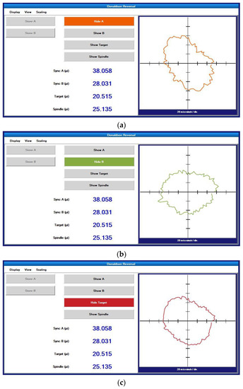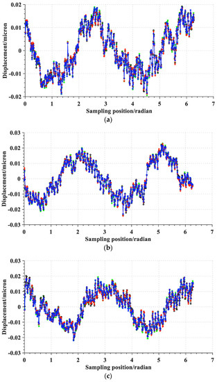 For the convenience of the discussion, the sampling data when the spindle speed is 60 revolutions per minute is selected as the first example. The raw data obtained by the in situ measurement and evaluation system is processed to remove the asynchronous error and eccentricity. Then, the synchronous error data are obtained. Figure 12a–c shows the amplitude phase diagrams of the multi-turn sampling data of the three sensors with the eccentricity and synchronization error removed in the polar coordinate system, respectively. Figure 13a–c show the amplitude phase diagrams of the multi-turn sampling data of the three sensors with the eccentricity and synchronization error removed in the Cartesian coordinate system, respectively.