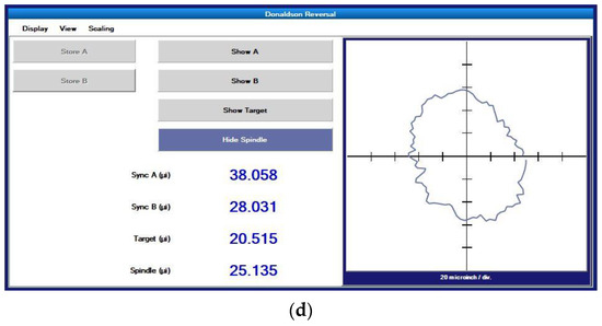 Donaldson reversal method measurement data: (a) synchronization error before reversal, (b) synchronization error after reversal, (c) roundness error of standard workpiece, (d) spindle radial error.