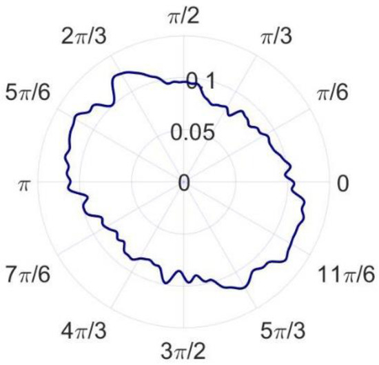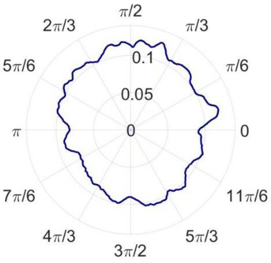 According to the error separation principle of the three-point method, the radial error and roundness error can be calculated, as shown in Figure 14 and Figure 15. The radial error of the spindle and the roundness error of the measured standard workpiece are 22.379 nm and 16.362 nm, respectively. Compared with the reference results, the radial error and roundness error differ from the reference results by 2.756 nm and 4.153 nm, respectively. According to the research results of Eric R. March [17,18], the reversal method has more theoretical advantages than the other methods, but it is also easier to couple more error components. The key to ensuring the measurement accuracy of the reversal method is to minimize the installation angle error and eccentricity error before and after the reversal, so the precision mechanism is generally used for reversal and installation positioning. In the comparative experiment, it is difficult to completely eliminate the error components introduced by the installation angle and eccentricity since no precision mechanism is used. As a result, the roundness error and radial error measured by the reversal method are larger and the measurement results of the in situ measurement and evaluation system are believed to be more accurate.