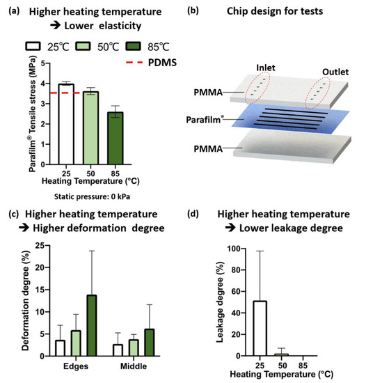 Effects of temperature and pressure on Parafilm® mechanical properties and deformation. (a) The higher the heating temperature, the lower the ultimate tensile stress of Parafilm®. Width of Parafilm® specimens: 15 mm. No pressure was applied to the Parafilm® specimens. (b) Chip design for leakage and deformation tests. Deformation degree (c) and leakage degree (d) of Parafilm® microchannels with different heating temperatures. Static press pressure: 33.3 kPa.