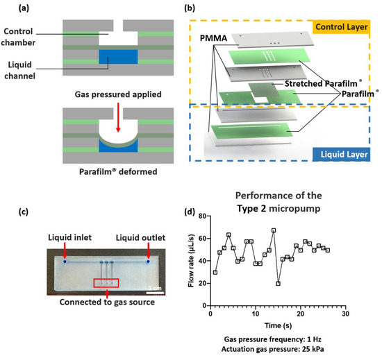 As shown in Figure 5b,c, the micropump was constructed of a control layer and a liquid layer. The received Parafilm® was directly used for fabricating the type 1 micropump. Stretched Parafilm® was used as an optimized type 2 micropump. The effect of the actuation gas pressure and the frequency of actuation on the pumping flow rate were studied, encompassing pressures of 25, 50, and 200 kPa and frequencies of 1, 2, 3, 5, and 20 Hz. The flow rate was measured by the volume of injected Trypan Blue water filled in the tubing (I.D. 1.6 mm, AVX42003, Saint-Gobain Performance Plastics, Paris, France) during a specific period. The bonding strength of the thermally bonded PMMA–Parafilm®–PMMA layers constituting the microvalve architecture was tested. No burst failure was observed for gas pressures of up to 200 kPa.